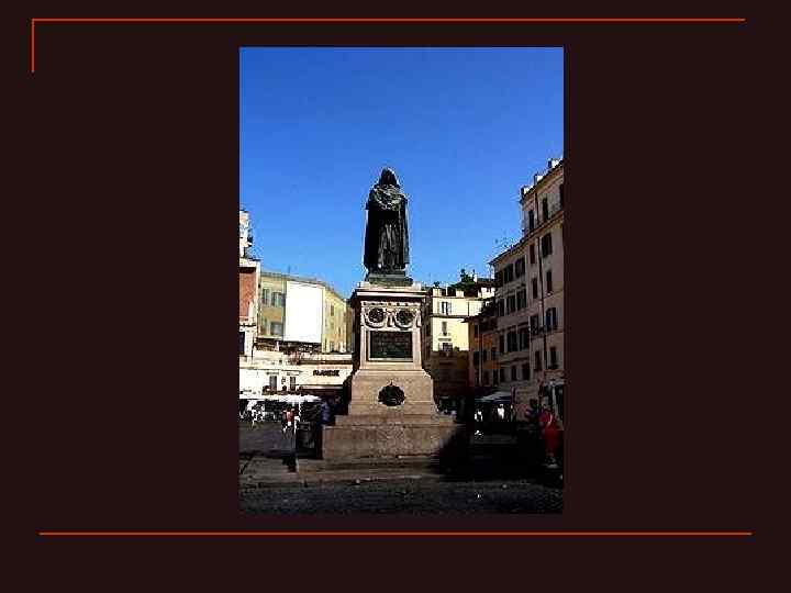 Архитектура n В 1889 году, спустя почти три столетия, на месте казни Джордано Бруно был воздвигнут памятник в его честь. На памятнике слова: «Он поднял свой голос за свободу мысли для всех народов и за эту свободу пошел на смерть» .
