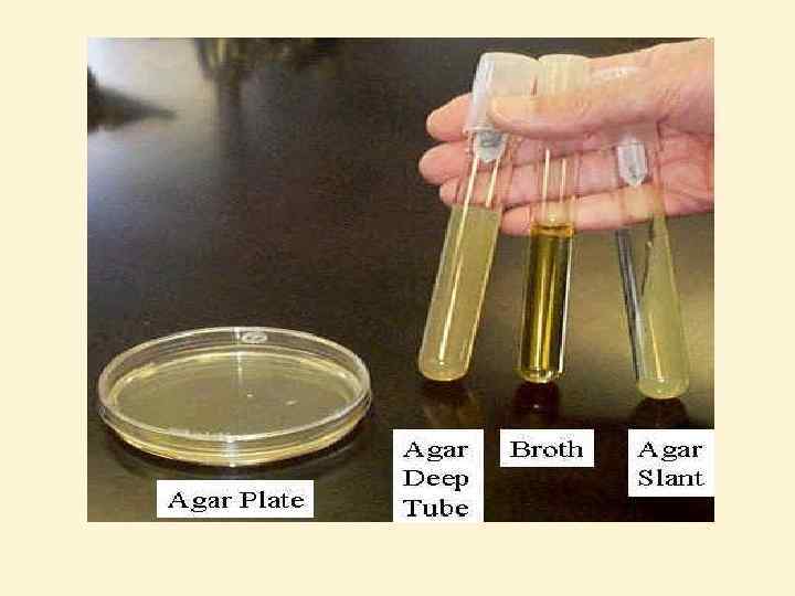 • АГАР – балдырлардан алынатын полисахарид. Ол 1000 С температурада балқып, 45 -500 С – та қатады. Жартылай сұйық орта жасау үшін 0, 5%, және тығыз орталар үшін 1, 5 -2% концентрацияда агар қосылады. • ҰЙЫҒАН ҚОРЕКТІК ОРТАЛАР – бұл құрамында қан сарысуы немесе ақуызбен (мысалы, жұмыртқа) байытылған орталар. • ТАБИҒИ ОРТАЛАР ет, балық және жеміс және т. б. табиғи өнімдерден дайындалады. • ҚАРАПАЙЫМ ТАБИҒИ ОРТАЛАР табиғи өнімдерден дайындалады. • КҮРДЕЛІ ТАБИҒИ ОРТАЛАР табиғи өнімдерге қоспалар қосылады (бояғыштар, қант, антибиотиктер, қан және т. б. )