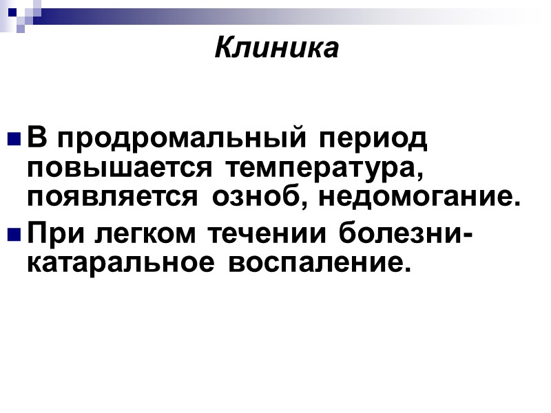 Клиника В продромальный период повышается температура, появляется озноб, недомогание. При легком течении болезни- катаральное воспаление.