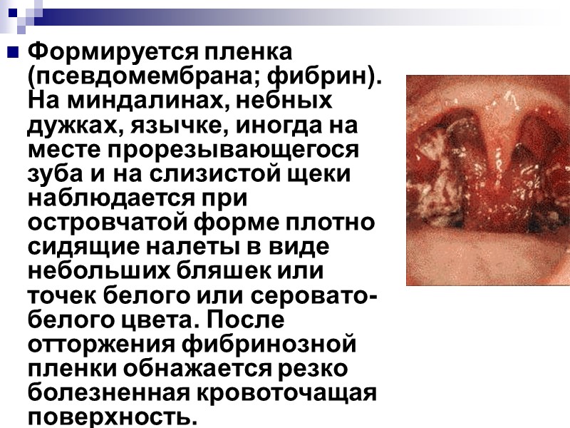 Формируется пленка (псевдомембрана; фибрин). На миндалинах, небных дужках, язычке, иногда на месте прорезывающегося зуба и на слизистой щеки наблюдается при островчатой форме плотно сидящие налеты в виде небольших бляшек или точек белого или серовато-белого цвета. После отторжения фибринозной пленки обнажается резко болезненная кровоточащая поверхность.