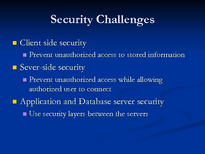 Security Challenges n Client side security n n Sever-side security n n Prevent unauthorized access to stored information Prevent unauthorized access while allowing authorized user to connect Application and Database server security n Use security layers between the servers