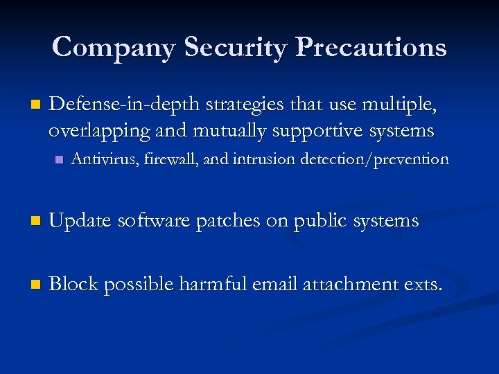 Company Security Precautions n Defense-in-depth strategies that use multiple, overlapping and mutually supportive systems n Antivirus, firewall, and intrusion detection/prevention n Update software patches on public systems n Block possible harmful email attachment exts.