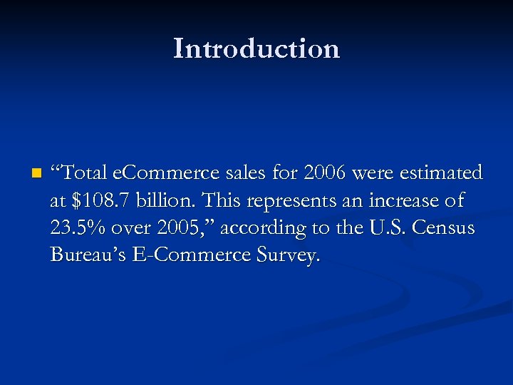 Introduction n “Total e. Commerce sales for 2006 were estimated at $108. 7 billion. This represents an increase of 23. 5% over 2005, ” according to the U. S. Census Bureau’s E-Commerce Survey.
