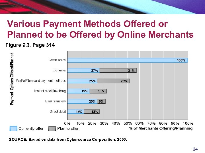 Various Payment Methods Offered or Planned to be Offered by Online Merchants Figure 6. 3, Page 314 SOURCE: Based on data from Cybersource Corporation, 2005. 14