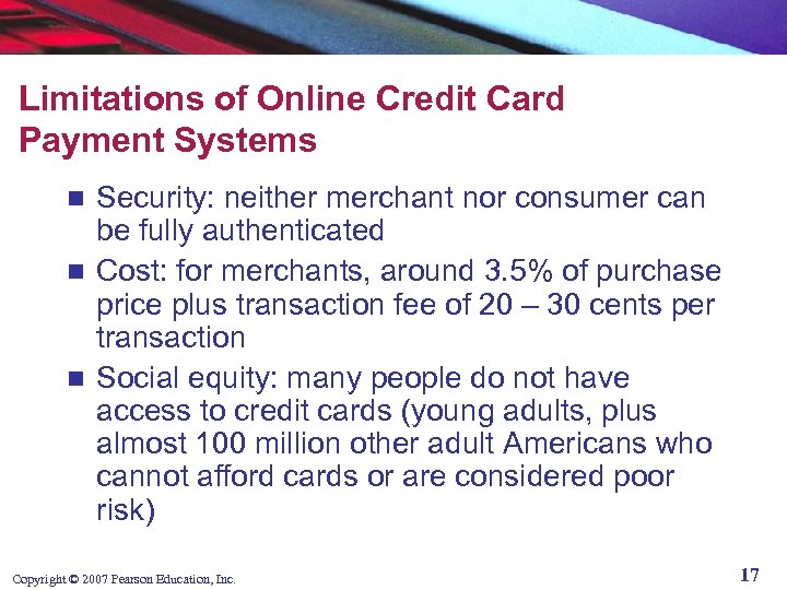 Limitations of Online Credit Card Payment Systems Security: neither merchant nor consumer can be fully authenticated n Cost: for merchants, around 3. 5% of purchase price plus transaction fee of 20 – 30 cents per transaction n Social equity: many people do not have access to credit cards (young adults, plus almost 100 million other adult Americans who cannot afford cards or are considered poor risk) n Copyright © 2007 Pearson Education, Inc. 17