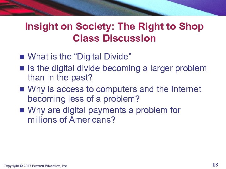Insight on Society: The Right to Shop Class Discussion What is the “Digital Divide” n Is the digital divide becoming a larger problem than in the past? n Why is access to computers and the Internet becoming less of a problem? n Why are digital payments a problem for millions of Americans? n Copyright © 2007 Pearson Education, Inc. 18