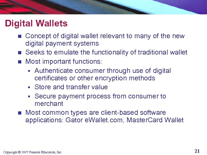 Digital Wallets Concept of digital wallet relevant to many of the new digital payment systems n Seeks to emulate the functionality of traditional wallet n Most important functions: § Authenticate consumer through use of digital certificates or other encryption methods § Store and transfer value § Secure payment process from consumer to merchant n Most common types are client-based software applications: Gator e. Wallet. com, Master. Card Wallet n Copyright © 2007 Pearson Education, Inc. 21