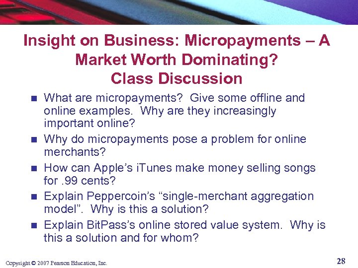 Insight on Business: Micropayments – A Market Worth Dominating? Class Discussion n n What are micropayments? Give some offline and online examples. Why are they increasingly important online? Why do micropayments pose a problem for online merchants? How can Apple’s i. Tunes make money selling songs for. 99 cents? Explain Peppercoin’s “single-merchant aggregation model”. Why is this a solution? Explain Bit. Pass’s online stored value system. Why is this a solution and for whom? Copyright © 2007 Pearson Education, Inc. 28