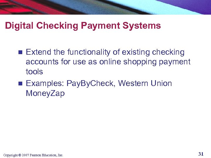 Digital Checking Payment Systems Extend the functionality of existing checking accounts for use as online shopping payment tools n Examples: Pay. By. Check, Western Union Money. Zap n Copyright © 2007 Pearson Education, Inc. 31