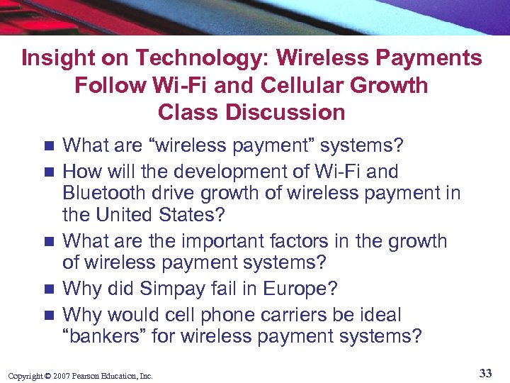 Digital Payment Systems and the Wireless Web Mobile payment (m-payments) systems not very well established yet in U. S, but with growth in Wi-Fi and 3 G cellular phone systems, this is beginning to change n Juniper Research predicts global mcommerce will total at least $88 billion by 2009, majority of transactions will be micro-mpayments n Copyright © 2007 Pearson Education, Inc. 32