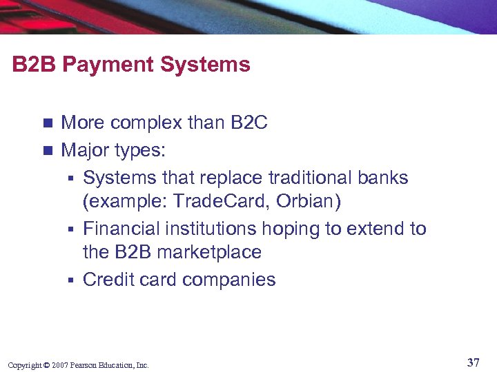 B 2 B Payment Systems More complex than B 2 C n Major types: § Systems that replace traditional banks (example: Trade. Card, Orbian) § Financial institutions hoping to extend to the B 2 B marketplace § Credit card companies n Copyright © 2007 Pearson Education, Inc. 37