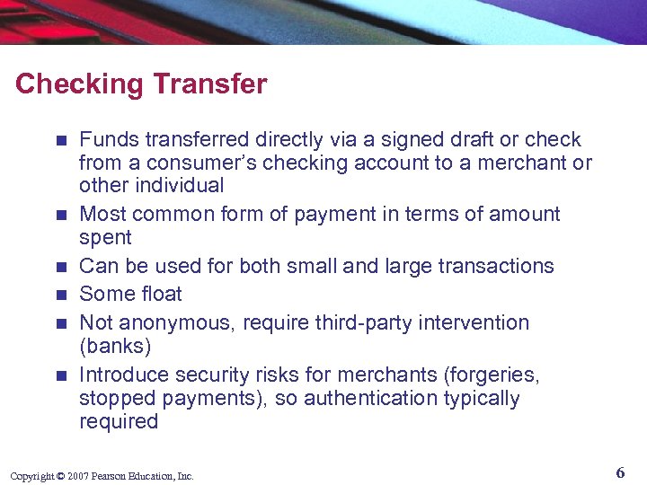 Cash n n n Legal tender defined by a national authority to represent value Most common form of payment in terms of number of transactions Instantly convertible into other forms of value without intermediation of any kind Portable, requires no authentication, and provides instant purchasing power “Free” (no transaction fee), anonymous, low cognitive demands Limitations: easily stolen, limited to smaller transaction, does not provide any float Copyright © 2007 Pearson Education, Inc. 5
