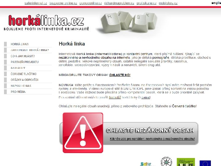 Horká linka www. horkalinka. cz Internetová Horká linka je kontaktní centrum, které přijímá hlášení o nezákonném a nevhodném obsahu na Internetu - dětská pornografie a prostituce, obchod s dětmi, pedofilie, věkově nepřiměřený obsah, ostatní nelegální sexuální praktiky, rasismus, xenofobie, sebepoškozování, výzvy k násilí a nenávisti, šíření drog, … Shromažďuje anonymně podněty uživatelů pomocí e-mailu a webového formuláře. Bojuje především proti zneužívání dětí při výrobě dětské pornografie. Předává podněty a získané informace Policii ČR. Ve spolupráci s poskytovateli internetových a mobilních služeb usiluje o zablokování a odstranění nezákonného obsahu. Spolupracuje s ostatními horkými linkami sdruženými v mezinárodní organizaci INHOPE.