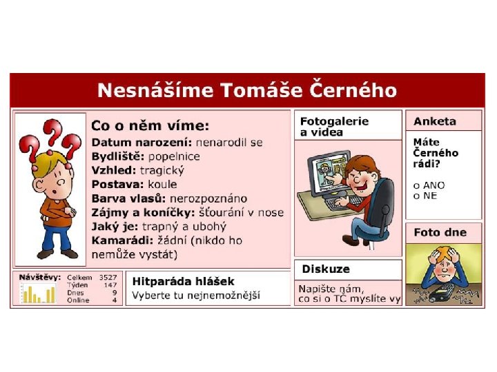 Ponižování a pomlouvání na internetu Příklad Robert vytvořil internetové stránky s názvem „Nesnášíme Tomáše Černého“. Na stránky umisťoval Tomášovy karikatury, vtipy o Tomášovi, pomluvy a ponižující ankety. Na existenci stránek upozornil většinu svých kamarádů. Ti začali v rámci diskuze Tomáše nevybíravým způsobem hodnotit a dál ponižovat. O této stránce se brzy dozvěděl také Tomáš.