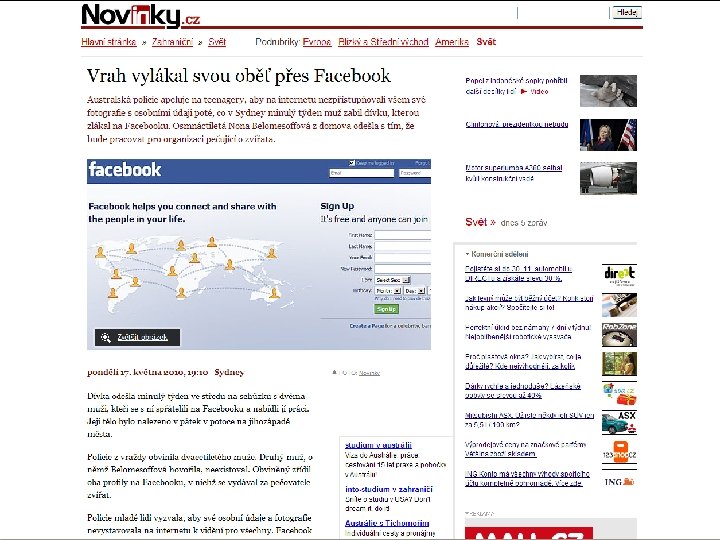 Kyberšikana v ČR - 2010 Klobouky u Brna Poté, co se dívka šestého ročníku zastala šikanovaného spolužáka, stala se sama obětí nejprve fyzické šikany (např. píchání kružítkem do ruky) a následně také kyberšikany. Spolužáci na sociální síti Facebook založili stránku s její fotkou, kde jí nadávali a posléze vyhrožovali smrtí jí i její matce. V diskuzi např. řešili, kdo a jak by ji měl zabít. Během krátké doby získala stránka 84 členů, mezi nimi i několik dospělých osob. Když se dívka o existenci stránky dozvěděla, psychicky se zhroutila a musela začít užívat léky. Olomouc Student střední školy vytvořil na sociální síti Facebook stránku, ve které on i ostatní spolužáci ponižovali a uráželi neoblíbenou spolužačku. Nakonec dívce začali také vyhrožovat fyzickým ublíženíma smrtí. V diskuzi např. řešili, jakým způsobem by se mohli zbavit jejího mrtvého těla, aby nemohla být identifikována (navrhovali, že by se mělo její tělo spálit, zuby rozřezat atd. ).