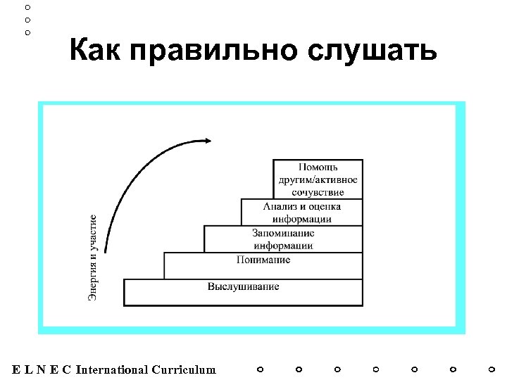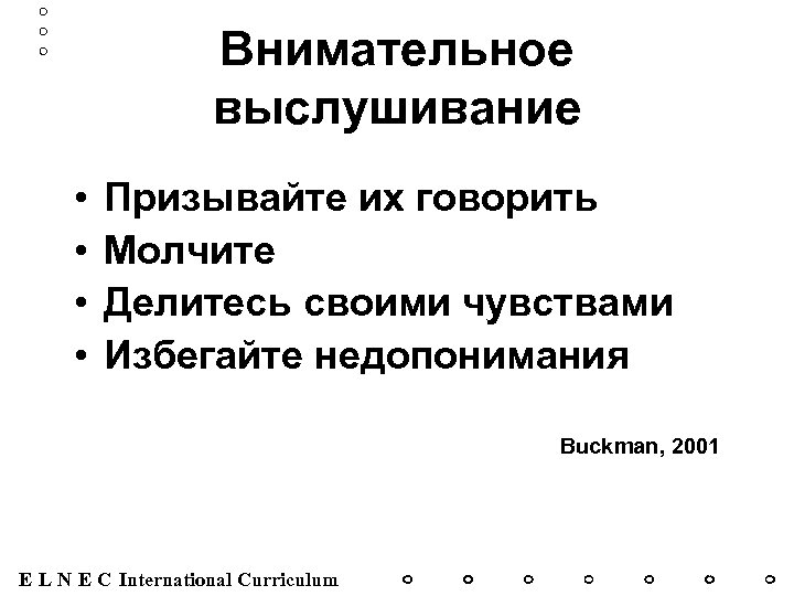 Внимательное выслушивание • • Призывайте их говорить Молчите Делитесь своими чувствами Избегайте недопонимания Buckman, 2001 E L N E C International Curriculum