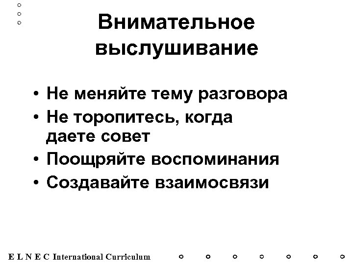 Внимательное выслушивание • Не меняйте тему разговора • Не торопитесь, когда даете совет • Поощряйте воспоминания • Создавайте взаимосвязи E L N E C International Curriculum