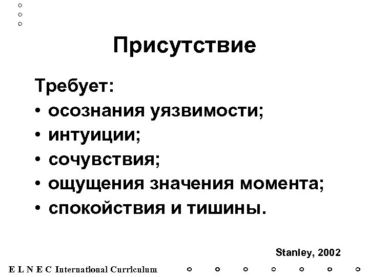 Присутствие Требует: • осознания уязвимости; • интуиции; • сочувствия; • ощущения значения момента; • спокойствия и тишины. Stanley, 2002 E L N E C International Curriculum