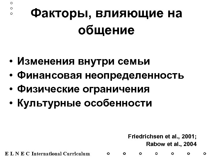 Факторы, влияющие на общение • • Изменения внутри семьи Финансовая неопределенность Физические ограничения Культурные особенности Friedrichsen et al. , 2001; Rabow et al. , 2004 E L N E C International Curriculum