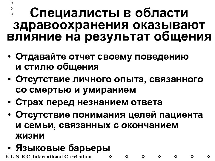 Специалисты в области здравоохранения оказывают влияние на результат общения • Отдавайте отчет своему поведению и стилю общения • Отсутствие личного опыта, связанного со смертью и умиранием • Страх перед незнанием ответа • Отсутствие понимания целей пациента и семьи, связанных с окончанием жизни • Языковые барьеры E L N E C International Curriculum