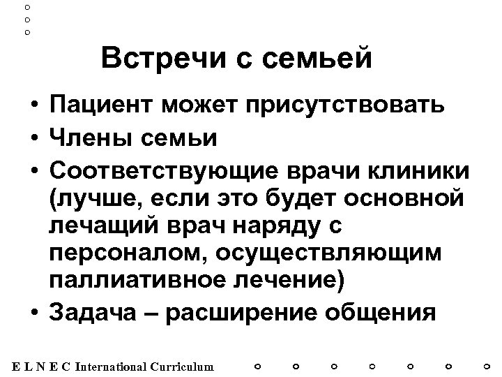 Встречи с семьей • Пациент может присутствовать • Члены семьи • Соответствующие врачи клиники (лучше, если это будет основной лечащий врач наряду с персоналом, осуществляющим паллиативное лечение) • Задача – расширение общения E L N E C International Curriculum