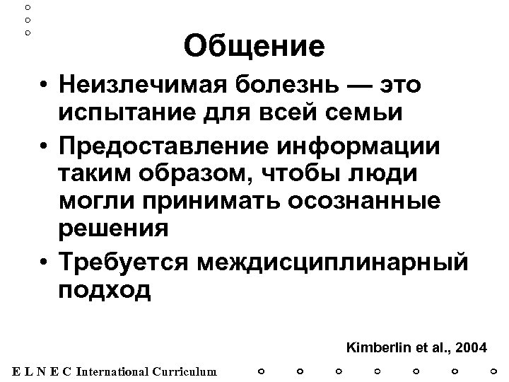 Общение • Неизлечимая болезнь — это испытание для всей семьи • Предоставление информации таким образом, чтобы люди могли принимать осознанные решения • Требуется междисциплинарный подход Kimberlin et al. , 2004 E L N E C International Curriculum