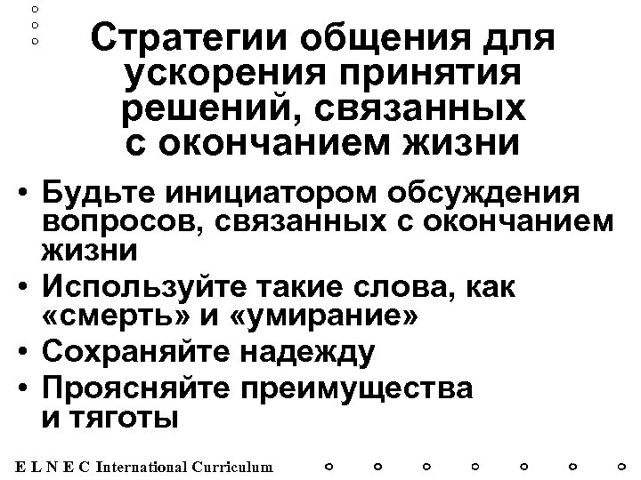 Стратегии общения для ускорения принятия решений, связанных с окончанием жизни • Будьте инициатором обсуждения вопросов, связанных с окончанием жизни • Используйте такие слова, как «смерть» и «умирание» • Сохраняйте надежду • Проясняйте преимущества и тяготы E L N E C International Curriculum