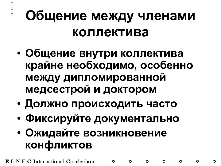 Общение между членами коллектива • Общение внутри коллектива крайне необходимо, особенно между дипломированной медсестрой и доктором • Должно происходить часто • Фиксируйте документально • Ожидайте возникновение конфликтов E L N E C International Curriculum
