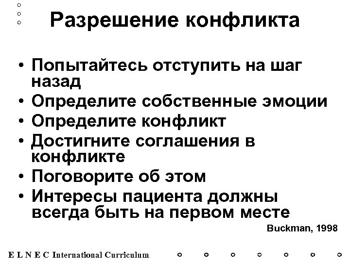 Разрешение конфликта • Попытайтесь отступить на шаг назад • Определите собственные эмоции • Определите конфликт • Достигните соглашения в конфликте • Поговорите об этом • Интересы пациента должны всегда быть на первом месте Buckman, 1998 E L N E C International Curriculum