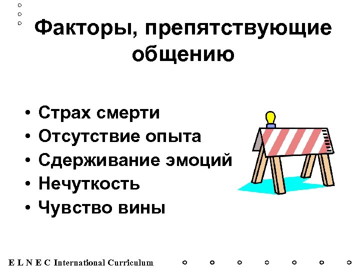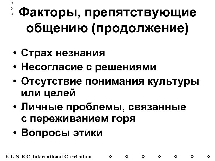Факторы, препятствующие общению (продолжение) • Страх незнания • Несогласие с решениями • Отсутствие понимания культуры или целей • Личные проблемы, связанные с переживанием горя • Вопросы этики E L N E C International Curriculum