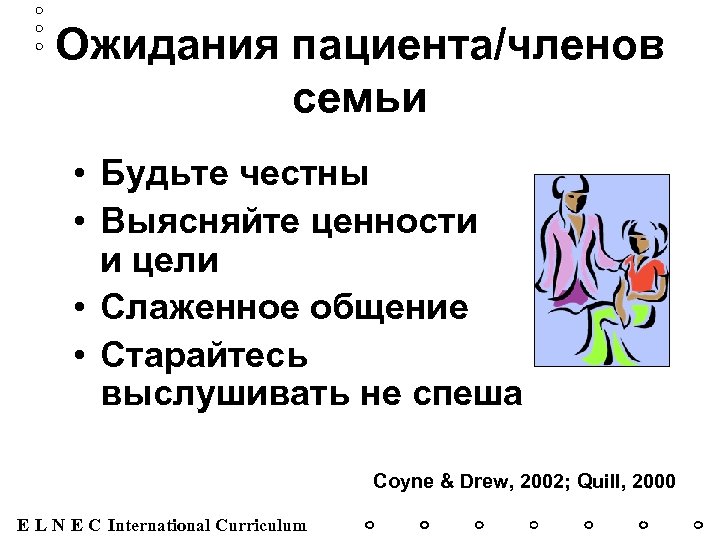 Ожидания пациента/членов семьи • Будьте честны • Выясняйте ценности и цели • Слаженное общение • Старайтесь выслушивать не спеша Coyne & Drew, 2002; Quill, 2000 E L N E C International Curriculum