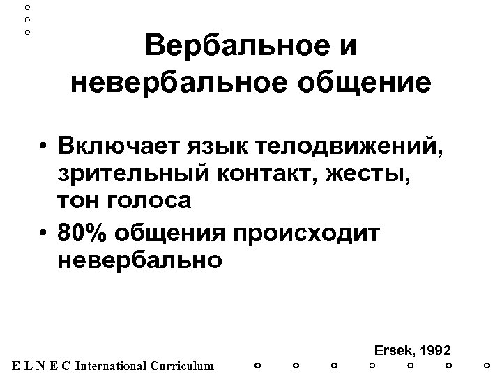Вербальное и невербальное общение • Включает язык телодвижений, зрительный контакт, жесты, тон голоса • 80% общения происходит невербально Ersek, 1992 E L N E C International Curriculum