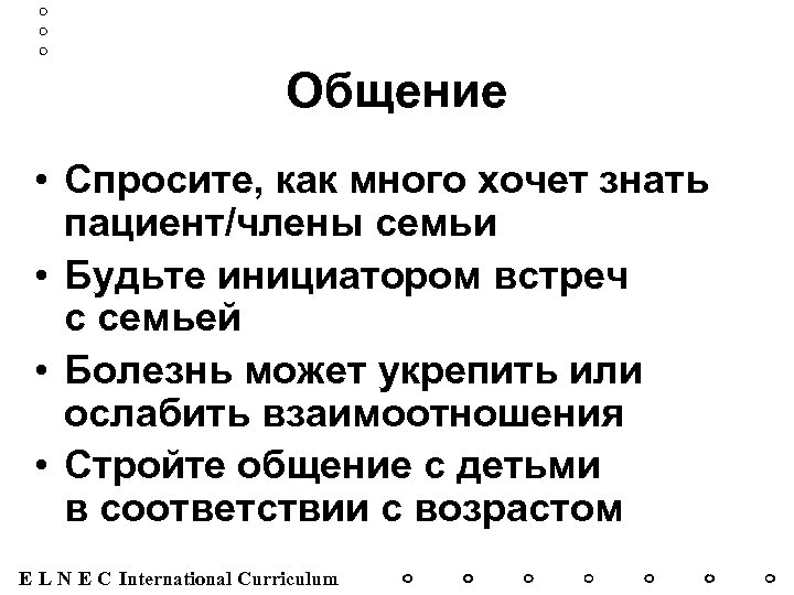 Общение • Спросите, как много хочет знать пациент/члены семьи • Будьте инициатором встреч с семьей • Болезнь может укрепить или ослабить взаимоотношения • Стройте общение с детьми в соответствии с возрастом E L N E C International Curriculum