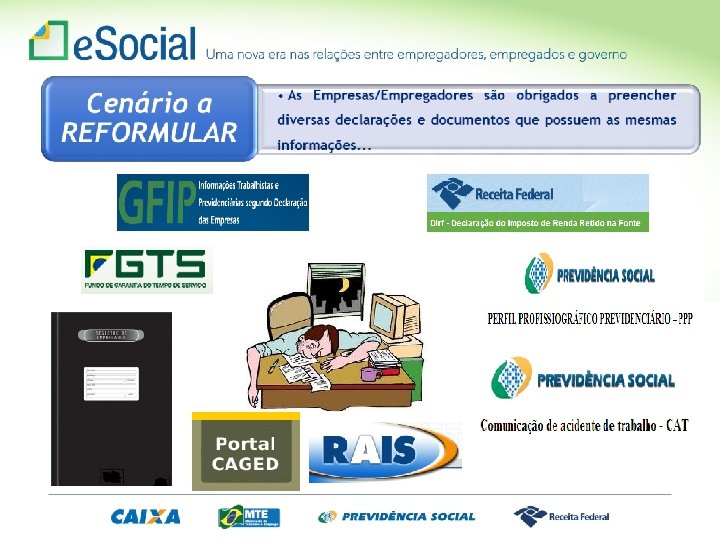 Princípios • Viabilizar a garantia de direitos previdenciários e trabalhistas; • Racionalizar e simplificar o cumprimento de obrigações; • Eliminar a redundância nas informações prestadas pelas pessoas físicas e jurídicas; • Aprimorar a qualidade de informações das relações de trabalho, previdenciárias e tributárias; • Conferir tratamento diferenciado às microempresas e empresas de pequeno porte. (Decreto 8373/2014)