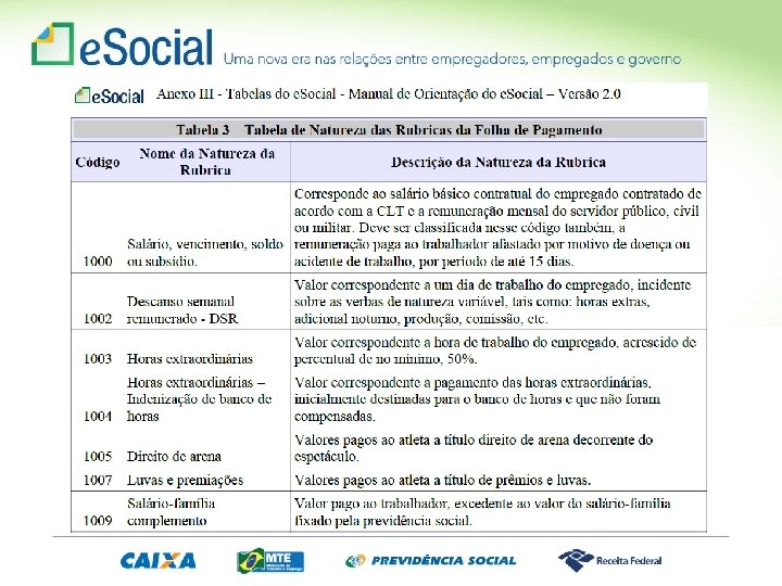 S-1010 – Tabela de rubricas • A empresa pode manter a sua própria tabela de rubricas utilizada atualmente • Exige uma análise prévia da tabela de rubricas da empresa com vistas a verificar as suas incidências para o FGTS, Previdência Social, IRRF • Deve correlacionar a tabela de rubricas da empresa com a tabela 3 – Tabela de Natureza das Rubricas