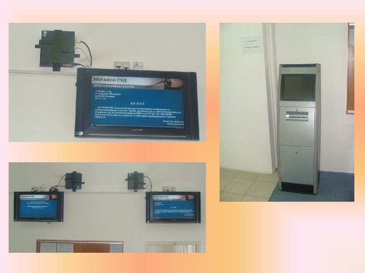 Набавка на дисплеи во судовите Целта на проектот е зголемување на транспарентноста на работата на судовите Поедноставен пристап до податоци и информации од страна на граѓаните Набавени и инсталирани се: 17 73 100 10 40'' Display LCD 32'' Display LCD компјутери touchscreen екрани во големите судови Проект поддржан од страна на Владата на Република Македонија Завршен во август 2008 година дневни распореди по судии дневни распореди по судници дневни распореди по броеви на предмети други информации за работата на судовите