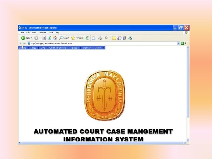 Управување со судски предмети I фаза – Судски информациони систем до 2007 година II фаза – Автоматска распределба на предмети 2007 – 2008 година III фаза – ACCMIS – Automated Court Case Management Information System – Автоматски судски информатички систем за управување со судски предмети ACCMIS e имплементиран во текот на 2009 година Префрлени се сите стари предмети од СИС Официјален почеток од 01. 2010