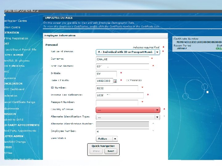 Overview • 2016/08 -Introducing a new EMP 501 form as well as pre-population of the EMP 201 return and payment data on record at SARS. • New Audit functionality was added to receive and manage Audit letters and requests for EMP 201’s and EMP 501’s – letters received in Notification centre and Action Centre • A new Action Centre was added to enable users to manage Audit cases (EMP 201’s and EMP 501’s) • Enhancements and corrections to manual capture and manual validation. • Introduction of a new status field on Employee demographic screen where user can indicate “Active/Inactive” status for employees • Correction to Employee Postal address fields, as well as new, optional structured and unstructured postal address fields. • Please visit the SARS website www. sars. gov. za for additional documentation and guides.