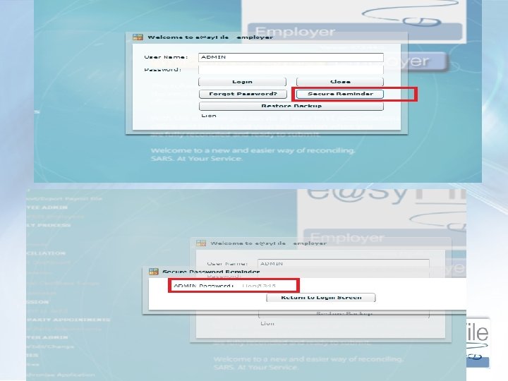 Lost e@syfile password • Type in “ADMIN” as username and use the “Secure reminder” and • “Forgot password option on login screen