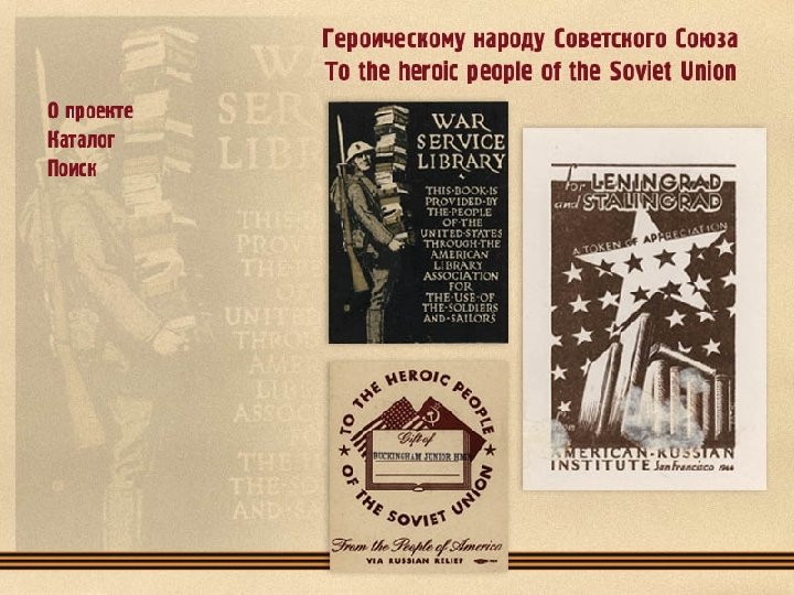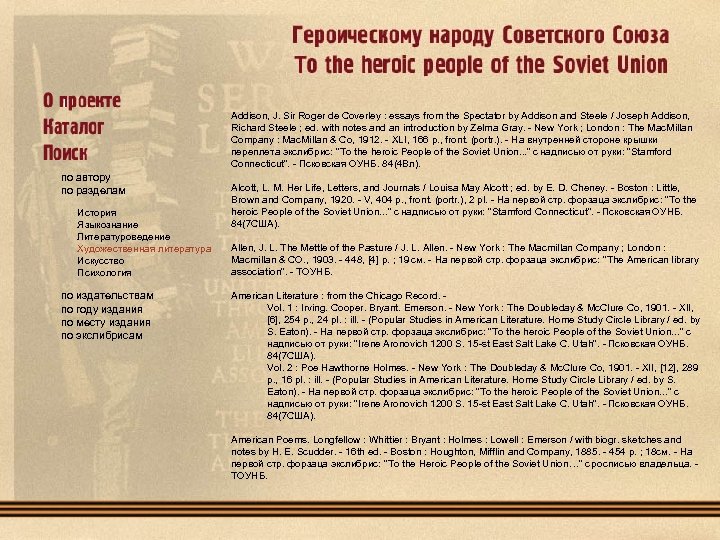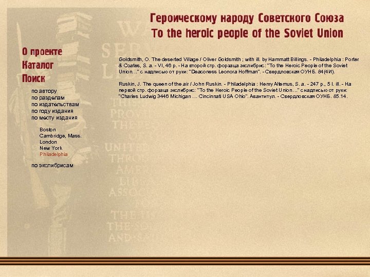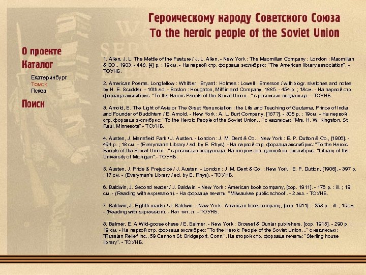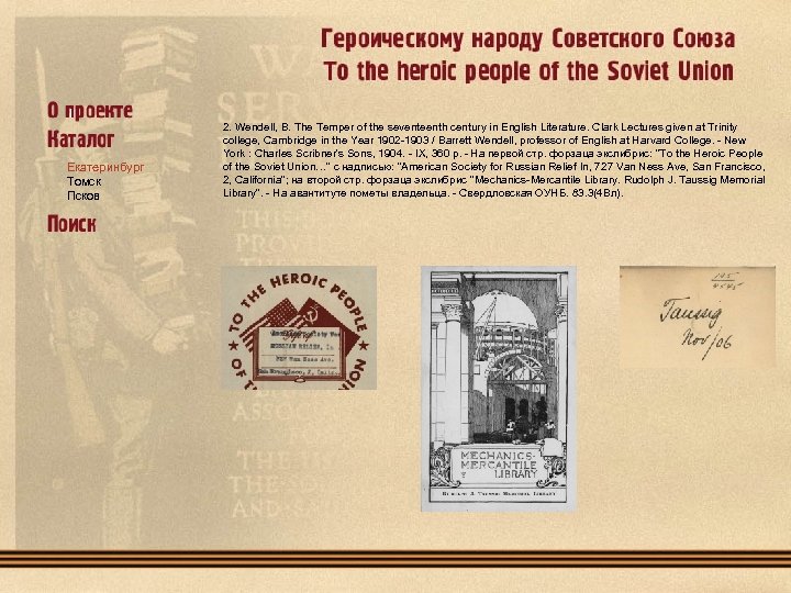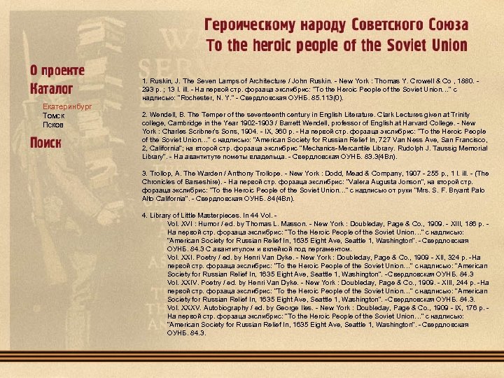 1. Ruskin, J. The Seven Lamps of Architecture / John Ruskin. - New York : Thomas Y. Crowell & Co , 1880. 293 p. ; 13 l. ill. - На первой стр. форзаца экслибрис: "To the Heroic People of the Soviet Union…" с надписью: "Rochester, N. Y. " - Свердловская ОУНБ. 85. 113(0). Екатеринбург Томск Псков 2. Wendell, B. The Temper of the seventeenth century in English Literature. Clark Lectures given at Trinity college, Cambridge in the Year 1902 -1903 / Barrett Wendell, professor of English at Harvard College. - New York : Charles Scribner's Sons, 1904. - IX, 360 p. - На первой стр. форзаца экслибрис: "To the Heroic People of the Soviet Union…" с надписью: "American Society for Russian Relief In, 727 Van Ness Ave, San Francisco, 2, California"; на второй стр. форзаца экслибрис "Mechanics-Mercantile Library. Rudolph J. Taussig Memorial Library". - На авантитуте пометы владельца. - Свердловская ОУНБ. 83. 3(4 Вл). 3. Trollop, A. The Warden / Anthony Trollope. - New York : Dodd, Mead & Company, 1907 - 255 p. , 1 l. ill. - (The Chronicles of Barseshire). - На первой стр. форзаца экслибрис: "Valera Augusta Jonson", на второй стр. форзаца экслибрис: "To the Heroic People of the Soviet Union…" с надписью от руки "Mrs. S. F. Bryant Palo Alto California". - Свердловская ОУНБ. 84(4 Вл). 4. Library of Little Masterpieces. In 44 Vol. XVI : Humor / ed. by Thomas L. Masson. - New York : Doubleday, Page & Co. , 1909. - XIII, 186 p. На первой стр. форзаца экслибрис: "To the Heroic People of the Soviet Union…" с надписью: "American Society for Russian Relief In, 1635 Eight Ave, Seattle 1, Washington". - Свердловская ОУНБ. 84. 3 С авантитулом и вклейкой под пергаментом. Vol. XXI. Poetry / ed. by Henri Van Dyke. - New York : Doubleday, Page & Co. , 1909 - XII, 324 p. - На первой стр. форзаца экслибрис: "To the Heroic People of the Soviet Union…" с надписью: "American Society for Russian Relief In, 1635 Eight Ave, Seattle 1, Washington". - Свердловская ОУНБ. 84. 3 Vol. XXIV. Poetry / ed. by Henri Van Dyke. - New York : Doubleday, Page & Co. , 1909. - XIII, 244 p. - На первой стр. форзаца экслибрис: "To the Heroic People of the Soviet Union…" с надписью: "American Society for Russian Relief In, 1635 Eight Ave, Seattle 1, Washington". - Свердловская ОУНБ. 84. 3. Vol. XXXV. Autobiography / ed. by George Iles. - New York : Doubleday, Page & Co. , 1909 - IX, 176 p. На первой стр. форзаца экслибрис: "To the Heroic People of the Soviet Union…" с надписью: "American Society for Russian Relief In, 1635 Eight Ave, Seattle 1, Washington". - Свердловская ОУНБ. 84. 3.