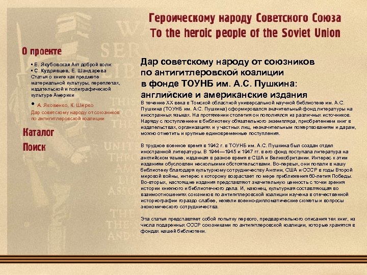 • Е. Якубовская Акт доброй воли: • С. Кудрявцев, Е. Шандарева Статья о книге как предмете материальной культуры, переплетах, издательской и полиграфической культуре Америки • А. Яковенко, К. Ширко Дар советскому народу от союзников по антигитлеровской коалиции в фонде ТОУНБ им. А. С. Пушкина: английские и американские издания В течение XX века в Томской областной универсальной научной библиотеке им. А. С. Пушкина (ТОУНБ им. А. С. Пушкина) сформировался значительный фонд литературы на иностранных языках. На протяжении столетия он пополнялся из различных источников. Наряду с поступлением в библиотеку обязательного экземпляра, приобретением книг в издательствах, организациях и у частных лиц, незначительным пожертвованиям и дарам, можно отметить и крупные единовременные поступления. В трудное военное время в 1942 г. в ТОУНБ им. А. С. Пушкина был создан отдел иностранной литературы. В 1944— 1945 и 1947 гг. в его фонд поступала литература на английском языке, изданная в разное время в США и Великобритании. Интерес к этим изданиям обусловлен несколькими обстоятельствами. Во-первых, они попали в нашу библиотеку благодаря культурному сотрудничеству Англии, США и СССР в годы Второй мировой войны, интерес к которому возрастает по мере приближения 60 -летия Победы. Во-вторых, настоящие издания представляют значительную ценность с точки зрения истории книжного и библиотечного дела. И, наконец, культурная составляющая во взаимоотношениях союзников по антигитлеровской коалиции изучена в отечественной историографии гораздо слабее, нежели военно-дипломатические сюжеты и вопросы экономического сотрудничества. Эта статья представляет собой попытку первого, предварительного описания тех книг, из числа подаренных СССР союзниками по антигитлеровской коалиции, которые хранятся в фондах нашей библиотеки.