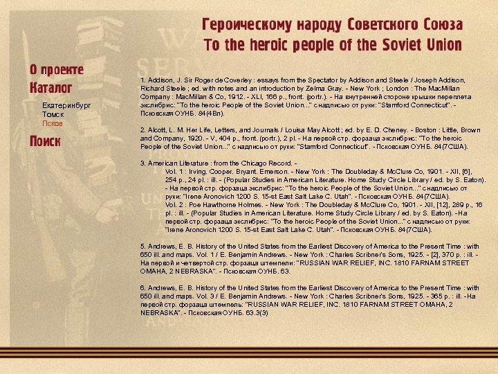 Екатеринбург Томск Псков 1. Addison, J. Sir Roger de Coverley : essays from the Spectator by Addison and Steele / Joseph Addison, Richard Steele ; ed. with notes and an introduction by Zelma Gray. - New York ; London : The Mac. Millan Company : Mac. Millan & Co, 1912. - XLI, 166 p. , front. (portr. ). - На внутренней стороне крышки переплета экслибрис: "To the heroic People of the Soviet Union. . . " с надписью от руки: "Stamford Connecticut". Псковская ОУНБ. 84(4 Вл). 2. Alcott, L. M. Her Life, Letters, and Journals / Louisa May Alcott ; ed. by E. D. Cheney. - Boston : Little, Brown and Company, 1920. - V, 404 p. , front. (portr. ), 2 pl. - На первой cтр. форзаца экслибрис: "To the heroic People of the Soviet Union. . . " с надписью от руки: "Stamford Connecticut". - Псковская ОУНБ. 84(7 США). 3. American Literature : from the Chicago Record. Vol. 1 : Irving. Cooper. Bryant. Emerson. - New York : The Doubleday & Mc. Clure Co, 1901. - XII, [6], 254 p. , 24 pl. : ill. - (Popular Studies in American Literature. Home Study Circle Library / ed. by S. Eaton). - На первой cтр. форзаца экслибрис: "To the heroic People of the Soviet Union. . . " с надписью от руки: "Irene Aronovich 1200 S. 15 -st East Salt Lake С. Utah". - Псковская ОУНБ. 84(7 США). Vol. 2 : Poe Hawthorne Holmes. - New York : The Doubleday & Mc. Clure Co, 1901. - XII, [12], 289 p. , 16 pl. : ill. - (Popular Studies in American Literature. Home Study Circle Library / ed. by S. Eaton). - На первой cтр. форзаца экслибрис: "To the heroic People of the Soviet Union. . . " с надписью от руки: "Irene Aronovich 1200 S. 15 -st East Salt Lake С. Utah". - Псковская ОУНБ. 84(7 США). 5. Andrews, E. B. History of the United States from the Earliest Discovery of America to the Present Time : with 650 ill. and maps. Vol. 1 / E. Benjamin Andrews. - New York : Charles Scribner's Sons, 1925. - [2], 370 p. : ill. На первой и четвертой стр. форзаца штемпели: "RUSSIAN WAR RELIEF, INC. 1810 FARNAM STREET OMAHA, 2 NEBRASKA". - Псковская ОУНБ. 63. 6. Andrews, E. B. History of the United States from the Earliest Discovery of America to the Present Time : with 650 ill. and maps. Vol. 3 / E. Benjamin Andrews. - New York : Charles Scribner's Sons, 1925. - 365 p. : ill. - На первой стр. форзаца штемпель: "RUSSIAN WAR RELIEF, INC. 1810 FARNAM STREET OMAHA, 2 NEBRASKA". - Псковская ОУНБ. 63. 3(3)
