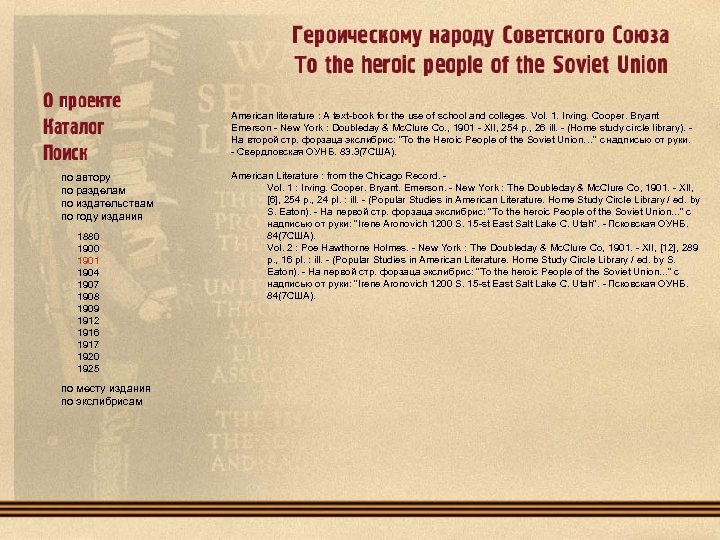 American literature : A text-book for the use of school and colleges. Vol. 1. Irving. Cooper. Bryant Emerson - New York : Doubleday & Mc. Clure Co. , 1901 - XII, 254 p. , 26 ill. - (Home study circle library). На второй стр. форзаца экслибрис: "To the Heroic People of the Soviet Union…" с надписью от руки. - Свердловская ОУНБ. 83. 3(7 США). по автору по разделам по издательствам по году издания 1880 1901 1904 1907 1908 1909 1912 1916 1917 1920 1925 по месту издания по экслибрисам American Literature : from the Chicago Record. Vol. 1 : Irving. Cooper. Bryant. Emerson. - New York : The Doubleday & Mc. Clure Co, 1901. - XII, [6], 254 p. , 24 pl. : ill. - (Popular Studies in American Literature. Home Study Circle Library / ed. by S. Eaton). - На первой cтр. форзаца экслибрис: "To the heroic People of the Soviet Union. . . " с надписью от руки: "Irene Aronovich 1200 S. 15 -st East Salt Lake С. Utah". - Псковская ОУНБ. 84(7 США). Vol. 2 : Poe Hawthorne Holmes. - New York : The Doubleday & Mc. Clure Co, 1901. - XII, [12], 289 p. , 16 pl. : ill. - (Popular Studies in American Literature. Home Study Circle Library / ed. by S. Eaton). - На первой cтр. форзаца экслибрис: "To the heroic People of the Soviet Union. . . " с надписью от руки: "Irene Aronovich 1200 S. 15 -st East Salt Lake С. Utah". - Псковская ОУНБ. 84(7 США).
