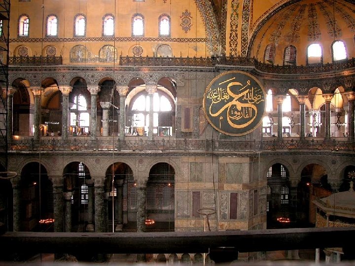 Mosiacs of Hagia Sophia n The mosaic were scrapped off the wall and covered with plaster by the Moslems when the converted the church into a mosque. n This was due to the fact their religion does not permit likenesses of people n Some mosaics have been uncovered n Also the Iconoclastic Controversy happened in the Christian religion as well for over 100 years (725 to 842 CE) and no art was produced in this period. After this period we have the second Golden Age of Byzantine. The plans of churches were based on the Greek cross, such a St. Marks’ discussed before.