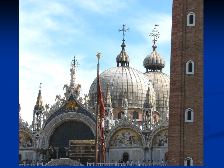 St. Marks –Venice-began 1063 The second church on this site was burned in a rebellion in 976, rebuilt in 978 and again to form the basis of the present basilica in 1063. Though straddling into the Romanesuqe era it is still considered a Byzantine design. • This is the largest and most lavish decorated church in the Second Golden Age • It was built to hold the body of St. Mark • It is based on a typical Greek cross plan • Each arm has a dome of it’s own • The exterior has many mosaics • Four horses formerly stood above the main entrance (they are now preserved in a museum)