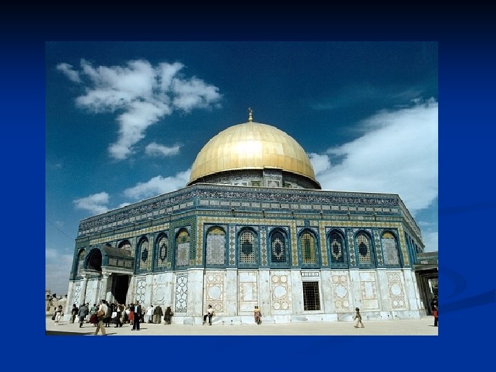 n Islamn Jerusalem was captured in 638 CE, six years after the death of Muhammad, by the Muslim Caliph Umar. Soon after his occupation of the city, Umar cleansed the Temple Mount, built a small mosque and dedicated the site to Muslim worship. n Nearby they built a more spectacular building, the Dome of the Rock, not only to proclaim the supremacy of Islam, but also to ensure that the new followers of Islam would not be tempted by Christianity. n Importance of the temple mount: A certain passage in the Koran links the Prophet Muhammad with Jerusalem and the Temple Mount. That passage, the seventeenth Sura, entitled 'The Night Journey', recounts the story of a dream Mohammed has where he takes a midnight ride (al-Isra) on his flying horse al-Buraq, which had the face of a woman, the body of a horse and the tail of Peacock. The narrative of the Koran in Sura 17 describes it as follows: "Glory be to Him, who carried His servant by night from the Holy Mosque to the further mosque, the precincts of which we have blessed. " … and from the sacred rock atop of the temple mount he made a spiritual trip to heaven and met the prophets before him) (it is stated in refeneces that this vision is around 617 and 624 A. D ). n n Muslim believe the two temples mentioned in this verse as being in Mecca and Jerusalem. At this hallowed site, known in Arabic as Haram al Sharif, the 9 th Caliph, Abd al-Malik, built the great Dome of the Rock between 687 CE and 691 CE to protect pilgrims. Adjacent to the Dome is the Al-Aqsa Mosque wherein Muslims make their prayers towards Mecca. Designed by Byzantine architects (not all text’s agree with this) engaged by the Caliph, the Dome of the Rock was the greatest monumental building in early Islamic history and remains today one of the most sublime examples of artistic genius that humanity has ever produced (the Great Mosque of Damascus, being a true mosque, is the earliest surviving monumental mosque).
