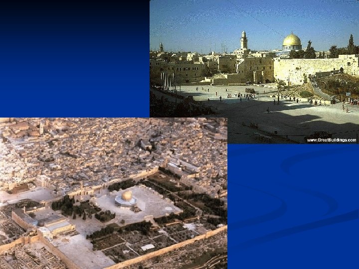 Dome of the Rock n n Mt. Moriah (site of Jerusalem)was considered highly sacred for several reasons Jewishn It was considered to be the site where Abraham (2000 BCE) had built an altar on which he prepared to sacrifice his son Isaac. n At this same site, the patriarch Jacob gathered stone from the altar upon which his father Isaac was to be sacrificed, and using this stone as a pillow spent the night sleeping upon the rock. Upon waking from a stunning visionary dream, Jacob anointed the stone pillow with oil he had received from heaven and the stone then sank deep into the earth, to become the foundation stone of the great temple that would later be built by Solomon. n The First Temple of the Jews was built during the reign of King Solomon (960 BCE). n Nebuchadrezzar II of Babylon forced the Jews into exile (most went to Babylon), and completely destroyed the temple in 586 BC. n In 539 BC, Persia conquered Babylon and allowed the Jews to return to Jerusalem. Reconstruction began and the Second Temple was completed by 515 B. C. E