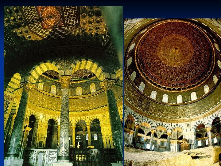 The Dome of the Rock-details n n The structure is octagonal and the dome is borne by a double system of pillars and columns. The walls, ceiling, arches, and vaults are decorated with floral images. The dome, on the inside, is covered with coloured and gilded stucco. The dome is 20 meters high, 10 meters in diameter, and its supporting structure, made of lead, was originally covered in pure gold (In 1960, as part of ( Jordan’s restoration, the dome was covered with a durable aluminium and bronze alloy made in Italy. The restoration was completed in August 1964. In 1998 the golden dome covering was refurbished following a donation of $8. 2 million by King Hussein of Jordan who sold one of his houses in London to fund the 80 kilograms of gold required. (Wipedica) The sacred foundation stone is encircled by sixteen arches that formerly came from different churches in Jerusalem, which were destroyed during the Persian occupation of the city in 614 AD. Writing of the sublimely beautiful structure with its heavenly dome, its columns of rare marble and its brilliant mosaics