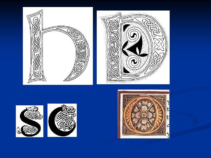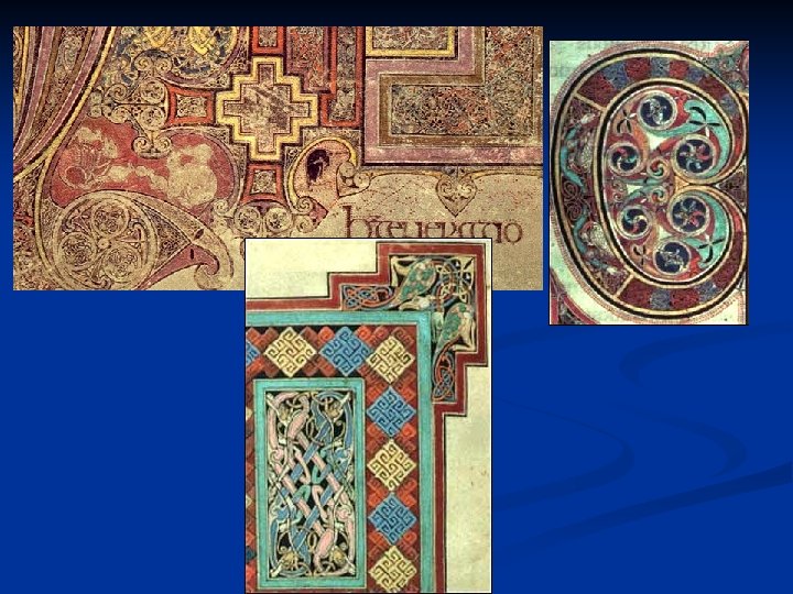 Manuscripts n n influenced by tribal tradition of geometric motifs and interlacing of letters, flowers and animals monks spent their lifetimes illustrating their pages of scripture while in their secluded monasteries ornamentation represents everything rich and beautiful paying tribute to God Lindisfarne Gospel Book (698 -721) Christianized Great Britain) n long time to illustrate one book n many vellum (parchment pages n ‘X-P” (chi-rho) is a contraction of the Greek name for Christ n interlaced with abstract and geometric designs of minute detail n hidden in the intricate scrolls are serpents dragons and other fantastic animals