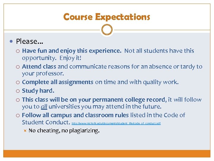 Course Expectations Please. . . Have fun and enjoy this experience. Not all students have this opportunity. Enjoy it! Attend class and communicate reasons for an absence or tardy to your professor. Complete all assignments on time and with quality work. Study hard. This class will be on your permanent college record, it will follow you to all universities you may attend in the future. Follow all campus and classroom rules listed in the Code of Student Conduct. http: //www. nicholls. edu/documents/student_life/code_of_conduct. pdf No cheating, no plagiarizing.